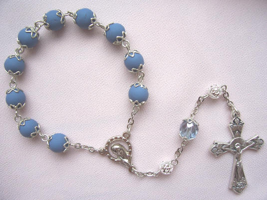 IMPORTANT: Single decade chaplets are available in the Flower Petal beads only. Due to the time and labor involved, the Flower Petal chaplets are only available when ordering two or more Flower Petal Rosaries. Single decade chaplets are priced at $20.00 each in base metal only. A single decade chaplet consists of ten Ave beads, one Our Father bead, one crucifix and one medal or center. Each chaplet comes in its own plastic case. The single decade chaplets are NOT available in the 100% Rose Petal beads. Please follow the Flower Petal Rosary instructions above for ordering the Flower Petal chaplets. Color samples of Flower Petal Chaplets (Click on photo to enlarge) (L to R) Terra Cotta, Dusty Rose, Dusty Blue, Light Pink, Sage Green, Light Violet, Carmine Red, Cobalt Blue, White, Yellow, and True Red. The Flower Petal chaplets shown above (L to R) Dusty Rose, Dusty Blue, Light Pink, Sage Green, Light Violet, Cobalt Blue, White, True Red. (Please note: The single decade chaplets are not considered bracelets.) (Chaplet designs may vary or change without notice)